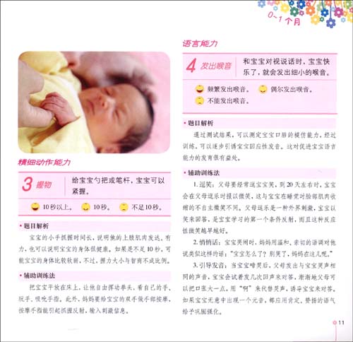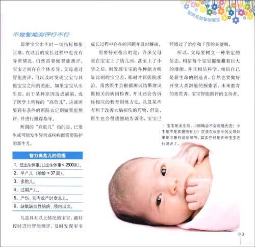 序言 宝宝诞生的过程是从母亲肚子的“海洋”降生到人类“陆地”的过程,对于他来说这是一个巨大的变化。接下来,宝宝将要再面临一次漫长而巨大的变化——智力发育。俗话说“三岁看大,七岁看老”,这是有科学道理的。3岁前是人一生中发育最快的时期,如脑的发育,新生儿脑的平均重量为390克,到3岁时,脑的平均重量为1100克,而成人的脑重量约1400克,由此可以看出,大脑重量的80%是在3岁以前形成的。本书中的智能测评正是针对宝宝智力发育的每一步来进行的,也是为了帮助父母找到宝宝每个成长阶梯上的新起点,使他从最佳的起点出发,从容地跨过一个个成长的里程碑。父母应该对测评给予重视,并适时促进宝宝智能发育;同时通过测评的结果,及时发现问题,以便早期诊断、早期干预。
