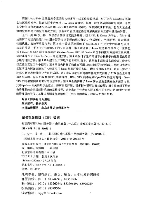 本书的内容全部来自于企业的实际生产环境,非常注重实践性和实用性,书中的所有案例都可以供大家在解决实际问题时参考和借鉴。本书从Linux服务器的虚拟化、生产环境下服务器的故障诊断与排除、生产环境下的SHELL脚本、高可用Linux集群建设、VPN在企业中的部署应用、Linux防火墙等多个方面阐述了构建高可用Linux服务器的方法与最佳实践。强烈推荐!