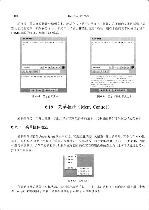 第6章:Flex控件(Controls)。详细介绍了文本控件、数据源控件、菜单控件、按钮控件、列表控件及其他各类控件。在讲解过程中结合了大量示例,以便为初学者提供帮助,直观认识每个控件的使用并了解其代码的书写。