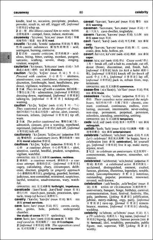 也许有人会说,要有一定英语基础才能使用这部词典。不错,是需要有一定基础,但是并不需要有很深厚的基础。我相信,只要具有高中或大学低年级英语程度的人,就能使用这部词典,开始时不免会感到有些生疏,但会越用越熟,逐渐扩大自己的词汇量。而且,首词、示例及注释都有对应的汉语译文,读者借助译文,很快就能入门。译文是由著名翻译家思果先生提供的,字斟句酌,十分考究。