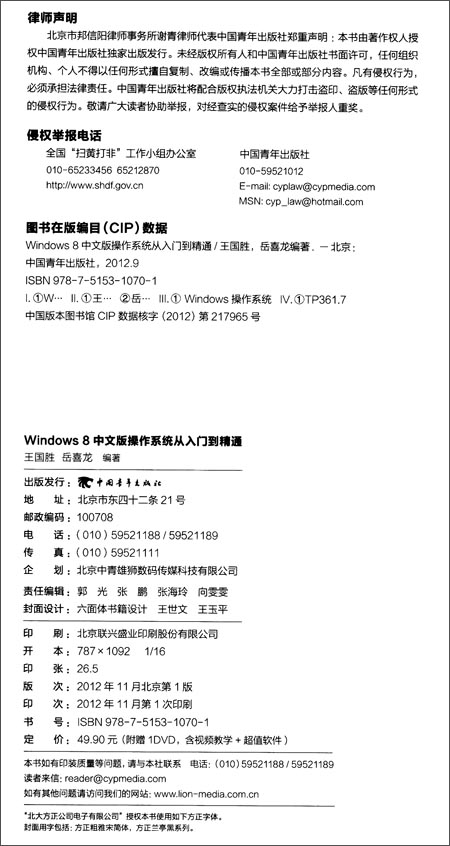 《Windows 8中文版操作系统从入门到精通》是专门为准备将操作系统升级到Windows 8的用户而写,旨在帮助广大用户将计算机操作系统轻松升级为Windows 8,并为用户提供必要的信息、建议和技巧。《Windows 8中文版操作系统从入门到精通》结构合理完整、语言浅显易懂、内容丰富全面。