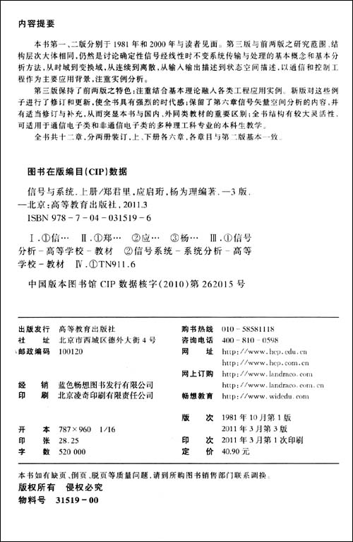 《信号与系统(第3版)(上册)》是教育部高等学校电子电气基础课程教学指导分委员会推荐教材。