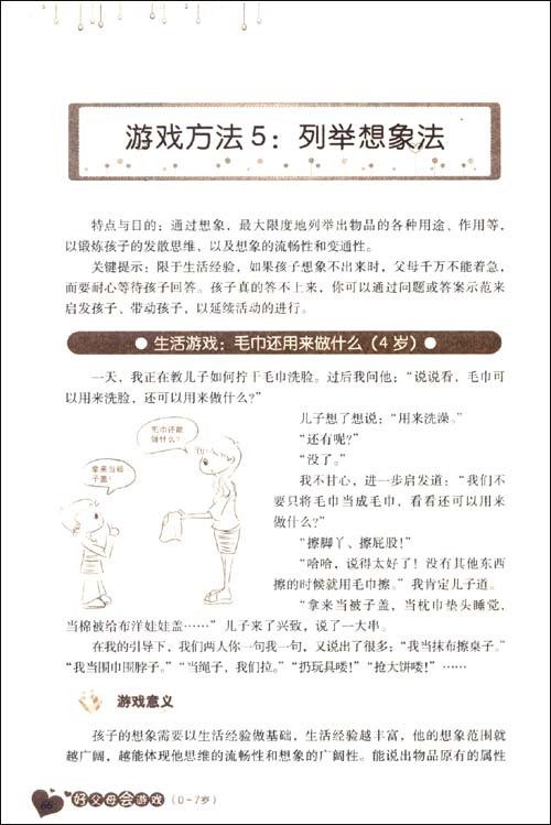 我想,如果我们父母能把这点“偷”学到,那该是多大的收获呀!可不是吗?源自她育儿生活中的每一个生动的游戏故事,都被她归在了某个方法中,我们可以根据这些方法以及提供的游戏启示来扩展和延伸游戏——我们也学当游戏魔术师!正如她所说的:“我这本书这样设计,就是想让父母们能够从中学会举一反三,学会创造、变通与思考。因为学会创造是一种教育资源,学会思考是一种游戏能力。”