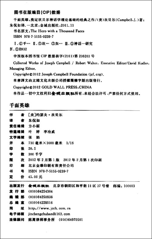 此外,为了方便读者阅读,中译本已将原书冗长细腻的批注予以简化,仅在对内文理解必要之处以译注的形式择要译出。至于引文(中译本的黑体字部分)的原注则直接在末了附上出处替代。并为免打断行文的流畅,主文中出现的引文出处原则上略去。关于文中繁杂的专有名词翻译,西方神话部分大体依据国立编译馆出版的《西洋神话》,印度传统的宗教文明以《佛光大辞典》为准,一般的中文译名则参考读者文摘版的《百科大辞典》。但尚无通行译名的专有名词,如非洲民俗传说或印地安人传奇等,则以音译为主。坎贝尔所引中国神话的英译数据,少部分名词在考证后无法确认原有相对中文名称的情况下,也只有在音译后加注说明,希望读者谅解。