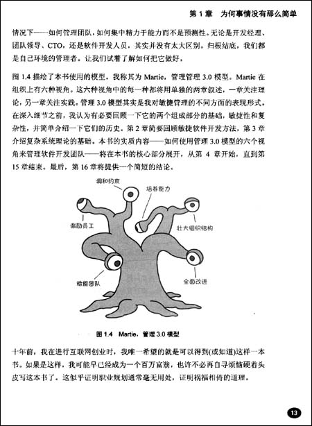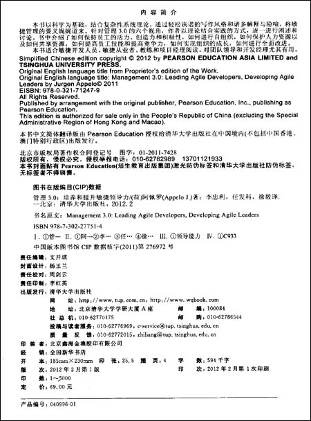《管理3.0:培养和提升敏捷领导力》编辑推荐:海尔集团首席执行张瑞敏推荐序,让每个人成为自己的CEO。针对处于管理职位的读者和即将升入管理职位的读者,JurgenAppelo分享了结合现代复杂系统理论和管理理论的洞见,折射出现代软件开发过程中的高度复杂性。Appelo的管理3.O模型认为,当下的组织机构是动态的网状系统,因此管理的要义在于人和人际关系。
