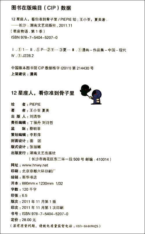 《12星座人,看你准到骨子里:星座控必入手之漫画》:新浪微薄十万粉丝追看;豆瓣网五千名粉丝热忱推荐;有妖气漫画网,三万多粉丝对漫画的综合评分高达9.72分。全彩四色原味呈现,并有精美星座卡贴相送。全书都是对星座本性戏谑式的搞笑,话题多多,是星座控们爱不释手的星座漫画书。