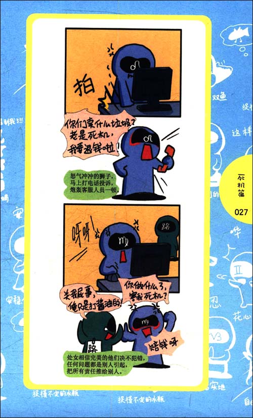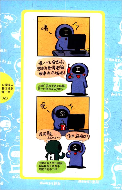 当初之所以画这个漫画,是因为看见身边的同学都是些很典型的星座。有个想当万人迷的白羊,有个大姐姐一样的巨蟹,有点笨的金牛(可是你也是很好的朋友哦),够义气的狮子,想法无厘头又搞笑的水瓶,有点酷酷的摩羯……看见身边同学的趣事,就想画出来,后来就整理成这本漫画了,真的有点想不到呢! 最意外的是,就是因为这漫画,才让我和我爱人认识了!(笨笨,I LOVE YOU啦!众人:闪光弹呀!)