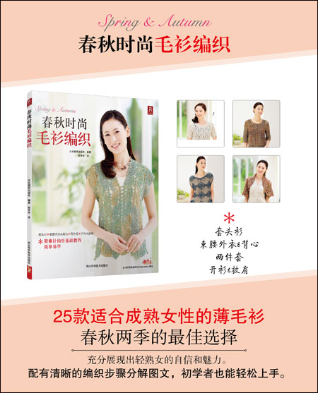 北京书中缘金牌产品“靓手工”书系。《春秋时尚毛衫编织》收录25款适合成熟女性的春秋毛衫,分为套头衫、束腰外衣&背心、两件套、开衫&披肩4种类型。作品既时尚又实用。实物照片与图文结合的编织解说直观且详尽易懂。全书均使用日本著名品牌和麻纳卡牌毛线进行编织,质地柔软不伤皮肤。为成熟女士提供出最棒的春秋毛衫选择。