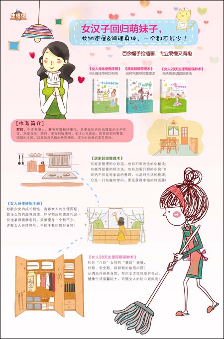 每个女人都希望了解自己的身体,但不是人人都能做到。身体使用手册是一种不需要依靠高学历,不需要依靠超高才智,也不要高超的谋略,只要按照简单的方法去做,每个人都能设计出一个好身体。女人身体使用手册全书用手绘插图的方式,详细介绍了女人一生的生理周期、荷尔蒙、皮肤、饮食、营养、孕前孕后、系统调理等身体密码,通过分解这些身体语言,让你更好地掌握自己的身体,让青春永驻,让美丽常在。