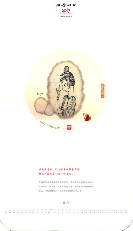 《水墨心经(2017)》讲述《心经》与《金刚经》都是在中国非常受欢迎、影响力深广的佛教经典,字字珠玑,诗意绵绵,禅韵无限,读来令人心意阔达,可入涅槃。蔡志忠先生创作的精美达摩、观音禅画与两部经书相配,天造设置,珠联璧合,实为绝世佳品。每幅挂历都选用蔡志忠先生的达摩、观音像各13幅,辅以经书原文与释文,制成2017年挂历,以飨读者。为方便受众悬挂供奉,每幅禅画亦可拆解入框。挂历高端大气,简约不凡,品味卓越,实为办公、居家及馈赠佳品!