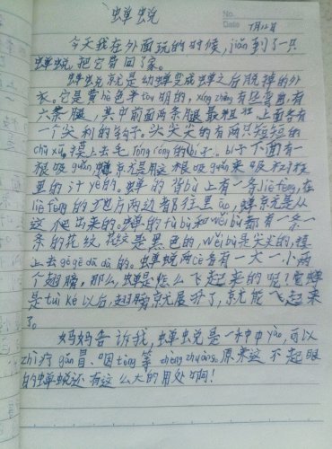 蝉蜕就是幼蝉变成蝉之后脱掉的外衣,它是黄褐色、半透明的,形状有些弯曲。有六条腿,其中前面两条腿最粗壮,上面各有一个尖利的钩子。它的头尖尖的,有两只短短的触须。鼻子摸上去毛茸茸的,鼻子下面有一根吸管,蝉就是用这根吸管来吸树枝里的汁液的。蝉的背部有一条裂缝,在裂缝的地方两边都往里凹,蝉就是从这里爬出去的。蝉蜕的腹部和尾部都有一条一条黑色的花纹,尾部尖尖的,摸上去疙疙瘩瘩的。蝉蜕两侧各有一大一小两个翅膀,那么,蝉是怎么飞起来的呢?蝉是蜕壳以后,翅膀就展开了,就能飞起来了。