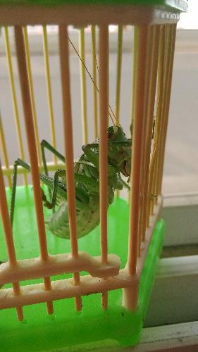 我就把蝈蝈带到了姥姥家。一回到姥姥家,我就问姥爷,“这只蝈蝈是雄的还是雌的?”姥爷说:“这只蝈蝈是雄的。”我问姥爷:“雄的和雌的有什么区别吗?”姥爷告诉我:“雄的后背有发音器,会叫。雌的不会叫,尾部有一个针形的产卵期。”