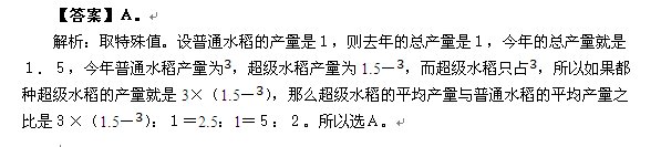某村的一块试验田,去年种植普通水稻,今年该试验田的 种上超级水稻,收割时发现该试验田的水稻总产量是去年总产量的1.5倍。如果普通水稻的产量不变,则超级水稻的平均产量与普通水稻的平均产量之比是: