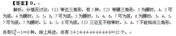 解析:由图可知,设最大的等边三角形的边长为x,则可知第二大的等边三角形的边长为x-a,第三大的等边三角形的边长为x-2a。第四大的等边三角形也即最小的等边三角形的边长为x-3a,从图中可知最大等边三角形是最小的等边三角形的边长的2倍,由此可知,x=2(x-3a),解得x=6a,由此可得周长为6a+5a+5a+4a+4a+3a+3a=30a。