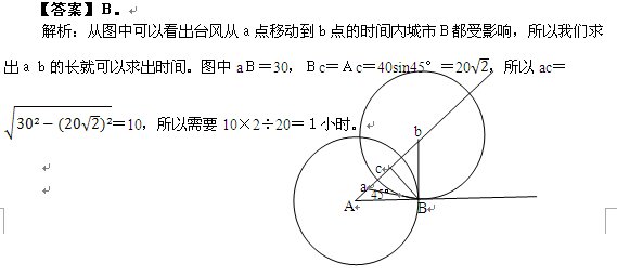 台风中心从A地以每小时20公里的速度向东北方向移动,离台风中心30公里内的地区为危险区,城市B在A的正东40公里处。B城处于危险区内的时间为: