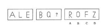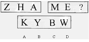解析:A。左边三个字母图都是由直线组成的,而右一组图中前两个字母图是由直线加曲线组成的,因此推理第三个图也是由直线加曲线组成。选项中仅有A项是由直线加曲线构成的字母图。