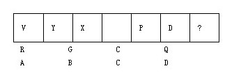 解析:D。在字母表中,字母A与C中间间隔一个字母B,同样C与E间隔一个字母D;根据这一规律,右一组图中P与R中间间隔Q,字母R间隔一个字母S之后的字母应为T,即为D选项。
