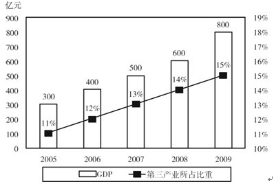 【解】 2005-2009年第三产业产值分别为:300×11%=33(亿元),400×12%=48(亿元),500×13%=65(亿元),600×14%=84(亿元),800×15%=120(亿元)。因此,第三产业总产值应该为:33+48+65+84+120=350(亿元)。