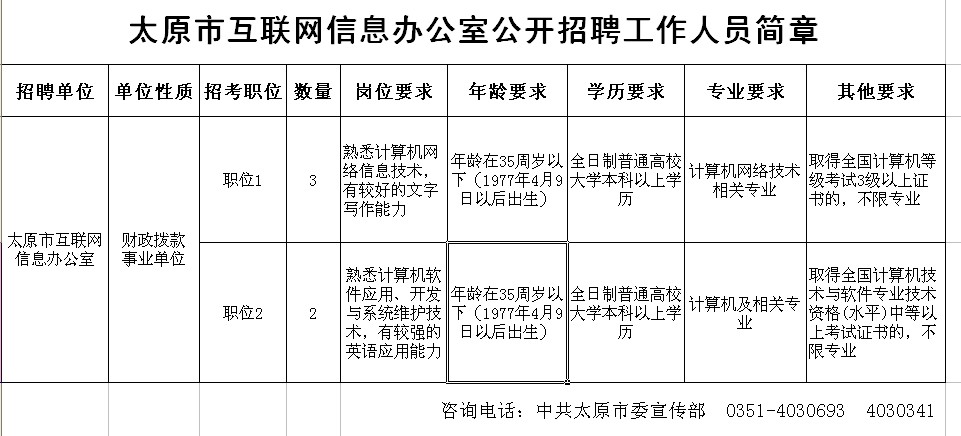 (四)年龄、学历及专业要求详见《太原市互联网信息办公室公开招聘工作人员简章》;