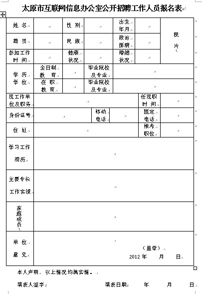 《太原市互联网信息办公室公开招聘工作人员报名表》在太原市人事考试网(http://www.typta.com.cn)和太原宣传网(http://www.tyxc.gov.cn)下载,或到报名地点领取。