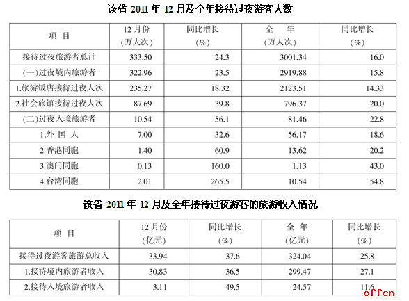 2011年某省接待过夜游客总量再次实现突破,达到3001.34万人次,同比增长16.0%。实现旅游收入324.04亿元,同比增长25.8%。12月份宾馆平均开房率为74.02%,同比增长0.06%;全年累计宾馆平均开房率为62.37%,同比增长2.0%。