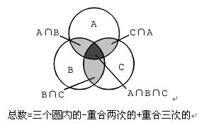 如果被计数的事物有A、B、C三类,那么,将A、B、C三个集合的元素个数相加后发现两两重叠的部分重复计算了1次,三个集合公共部分被重复计算了2次。