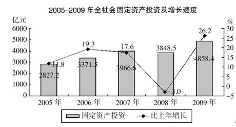 2009年全年北京市完成全社会固定资产投资4858.4亿元,比上年增长26.2%。其中,基础设施投资1462亿元,增长26%,主要投向交通运输和公共服务业,交通运输投资698.6亿元,增长15.6%,公共服务业投资434.5亿元,增长49%。