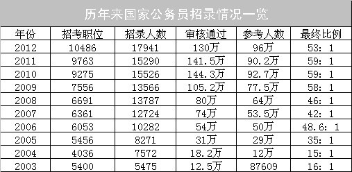 与10年前相比,报考国家公务员的人数越来越多,公务员这个“金饭碗”的热度不言而喻。但从2011年开始,总体的“公务员热”的氛围下,出现了微妙的变化。2011年,公务员报考人数首先出现了“负增长”,但因为招录人数较前一年有所减少,最终竞争比例也与2010年持平,所以趋势还难以定论;而2012年,国家公务员考试的“拐点”似乎是板上钉钉——招录近1.8万人创历史新高,130万人最终通过审核却创了历史新低,53人争一个岗位的比例也是三年来首次出现下降。