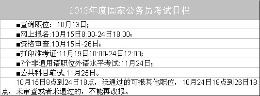 而考生最为关心的岗位情况也将“揭开盖头”来。2012年10月13日起,报考人员可登录人力资源社会保障部门户网站(http://www.mohrss.gov.cn)、国家公务员局门户网站(http://www.scs.gov.cn)及考试录用公务员专题网站(http://bm.scs.gov.cn/2013)查询招录部门、招录职位信息、招录政策、咨询电话以及招录公告等情况。15日-24日网上报名,公共科目笔试定于11月25日在各省会城市、自治区首府、直辖市和个别较大的城市同时举行。