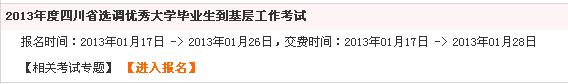 1.网上报名。符合选调条件、获得推荐的人员,于2013年1月17日- 1月26日24:00,登录四川人事考试网(http://www.scpta.gov.cn)报名并按网络提示上传JPG格式、20K左右的近期免冠证件照片(网上报名注意事项及填写说明见附件6,“代码”及“职位类别”、“报考地区”填写说明见附件8)。
