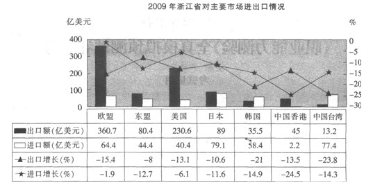 119.2009年浙江省对主要市场的出口额与进口额增长率排名相同的有( )。