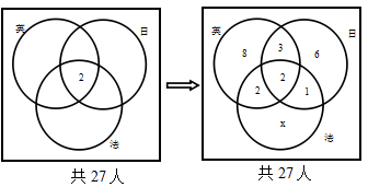 【例2】外语学校有英语、法语、日语教师共27人,其中只能教英语的有8人,只能教日语的有6人,能教英、日语的有5人,能教法、日语的有3人,能教英、法语的有4人,三种都能教的有2人,则只能教法语的有(  )。