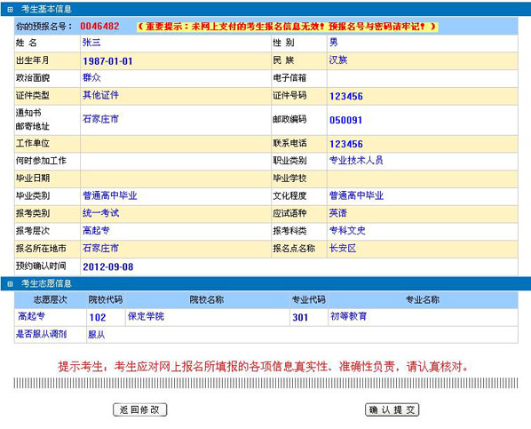 3、认真核对填写的各项报名信息(如出现姓名、身份证号同时不符的,报名信息不予确认),无误后提交。正确记录系统给出的网上“预报名号”,并牢记自己设定的“密码”(考生凭网上“预报名号”和“密码”可再次进入报名系统修改除“报考层次”以外的其他信息)。