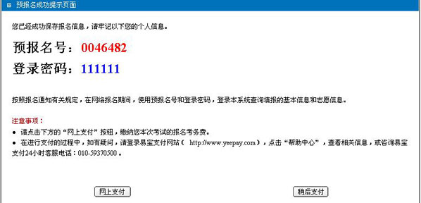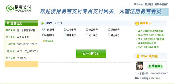 4、考生点击“网上支付”按钮,进入支付页面,按照页面的提示和要求支付报名考务费。(网上支付完成后仍可修改除“报考层次”以外的其未在网上支付报名考务费的考生不能进行报名信息确认,未进行报名信息确认的,其报名无效。若有网银支付等相关问题,可咨询易宝支付24小时客服电话:010-59370500。