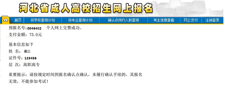 (二)仔细阅读并承诺遵守《河北省成人高校招生考生诚信考试承诺书》,按照网页的提示和要求,准确填写个人真实有效信息和报考学校、专业(即“意向志愿”)信息,并选择报名信息确认地点和确认时间。