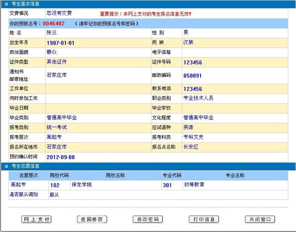 点击“稍后支付”,进入“网上预报名考生全部信息”页面,查看或修改除“报考层次”以外的其他信息,同时提供网上支付功能,