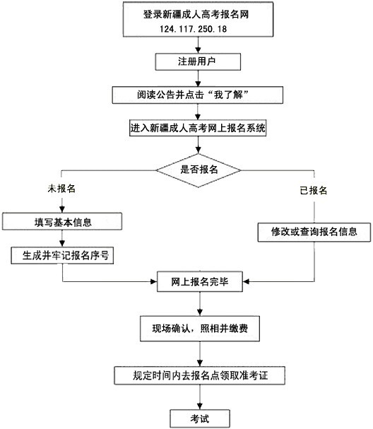 考生在规定的网上报名时间内,登陆新疆成人高考报名网站(网址:http:// 124.117.250.18)点击“成人高考网上报名”进入报名系统。