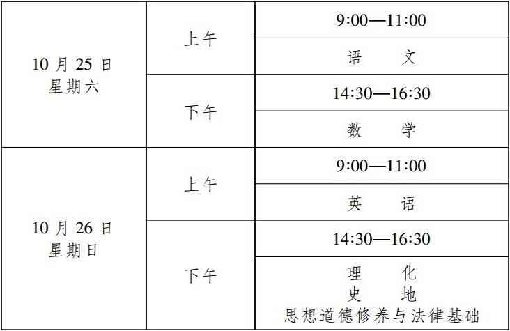 考试时间 考试日期为10月25日(星期六),10月26日(星期日),具体时间详见 “2014年云南省各类成人高等学校专科起点升本科考试时间表”。