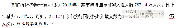 4. B[解析]倍数计算。根据材料“2013年,某市接待国内旅游者25990.68万人次,比上年增长3.6%”“2013年,某市接待国际旅游入境人数757.4万人次,比上年减少5.4%”可知,2013年,某市接待国内旅游者是接待国际旅游入境人数的25990.68/757.4≈26000/760,直除首两位为34。故本题答案为B。