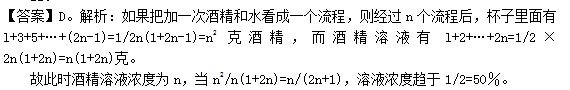 3.现有一个无限容积的空杯子,先加入1克酒精,再加入2克水,再加入3克酒精。再加入4克水,……,如此下去,问最终杯子中酒精溶液浓度为多少?