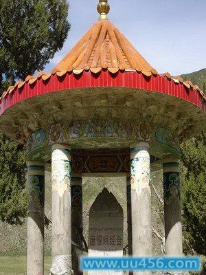 位于通天河大桥南岸,有一块巨大的岩石,旁边有几颗古柏,树上挂满经布。