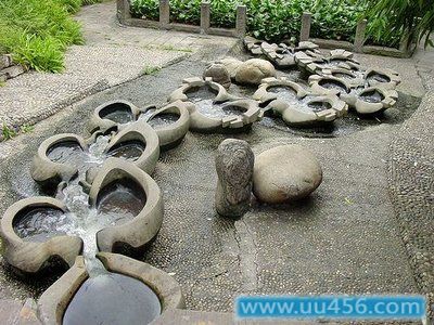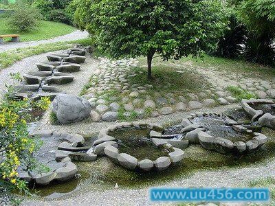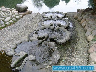 这一段河堤,像梯田一层层铺展到府水之滨,一缕缕碧草从“田”里的石缝间顽强地探出头来,织成一幅幅流青溢翠的“井”字地毯。这面山坡上郁郁葱葱有绿树有红花更有一片密麻麻比人还高的冷蕨苗,还有那咿咿呀呀悠然转动的水车,仿佛一下子把人带到那原始古朴的年代……取自府河水,依次流经厌氧池、流水雕塑、兼氧池、植物塘、植物床、养鱼塘等水净化系统,或涓涓细流,或激情跌宕,变幻出多姿多彩,并发生质的变化,向人们演示了水与自然界由“浊”变“清”、由“死”变“活”的生命过程。