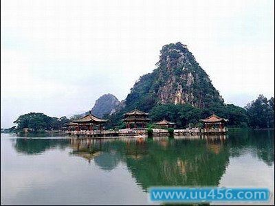 星湖在肇庆市北郊。原是北岭山前沼泽地,1955年冬始辟成湖。面积约6平方公里。湖中修有20余公里的长堤,将湖分