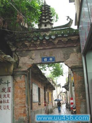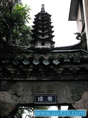 塔巷在郎官巷以南,西通南后街。原名修文巷,宋代改称兴文巷、文兴巷。以闽国时建育王塔于巷北而改今名。塔系木构,后不知毁于何时。清代在巷内砌造半爿小塔,作为古迹纪念。20世纪50年代,小塔移置坊口。