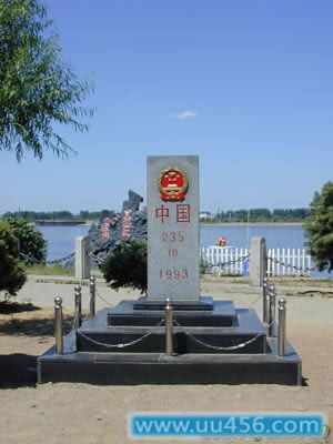 国界碑--此界界碑为黑龙江段235号界碑。碑身高约1.2米,呈方柱型,上部镶嵌有中华人民共和国国徽,界碑材质为坚硬的黑灰色花岗岩,四周有铁艺围栏保护。