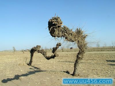看惯了挺拔俊俏树种的人,也许对这些树怪嗤之以鼻,可曾饱受风沙之苦的当地人,却认为她怪得美,怪的可爱,她那遍及全身的疤痕记载着日月的艰辛,生存的悲壮,她那每年复生的嫩绿枝条,实在是吟唱着一曲生命的赞歌。