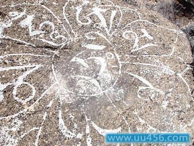 整个岩画是在一块巨大岩石上雕凿的。岩画内容既有单个的图案,如人物、动物、日、月、塔、藏文字母,也有组合的图案,如张弓射箭、骑马的、骑牛的人、奔跑的人等。它既反映了人类早期狩猎的原始生活,也反映了人们对大自然的认识,同时佛教的思想也反映在绘画上。
