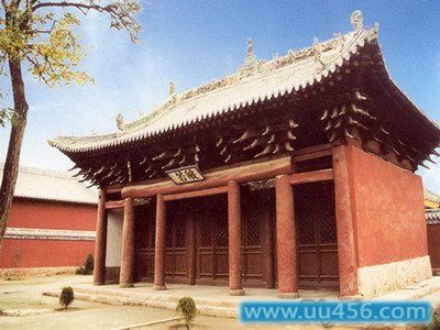 秦安兴国寺位于秦安县城北街。是一组风格古朴,造型奇特,保存较好的元代建筑群。据载创建于元至顺三年(1332),兴国寺经过六百多年的变迁,其它建筑大多瘫塌,只有山门、钟楼、鼓楼、般若殿安稳如磐,迄今完好。般若殿坐东向西,面阔三间,通长11.7米,进深两间三椽,单檐歇山顶,上布灰筒板瓦,正脊两端各安一条龙吻,二龙怒目卷尾,张口吞脊,活龙活现。正中部饰以琉璃兽面,上置一火珠,两侧置走兽。垂脊和戗脊上饰兽,戗脊上还置天王、狮、豹、马、狗等。大殿架梁用六根檐柱支撑,当中两根檐柱,浑圆硕大,柱头卷杀为覆盆状,柱身下用素面圆形柱础,无雕饰,次间额栋札牵雕龙首。殿内无粗大金柱,仅在斜梁和内额的下皮设置直径约十五厘米的四根小柱。兴国寺般若殿,整体雄浑谐调,轮廓稳定秀美。虽经历代多次重修,但梁架结构,斗拱风格,仍保持了元代建筑的特征。大殿阑额上方悬明嘉靖时期胡缵宗书“般若”木匾,是一件珍贵的书法艺术。