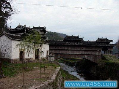 如龙桥位于庆元县举水月山村南侧,为省级文保单位。明天启五年(1625)建,横卧举溪之上,其势与山脊依稀相连,看似龙首下倾,故名。桥为木拱架廊屋结构,东北端建三重檐歇山顶钟楼,西南端有桥亭,其与廊屋当心间皆为重檐歇山顶。钟楼与近旁的马仙宫殿阁相对,浑然一体。桥亭三面辟门,穿亭而过,为去闽古道,造型讲究,结构科学,工艺精巧,年代久远,是浙西南现存历史最早的木拱廊桥,极具考古和科研价值。
