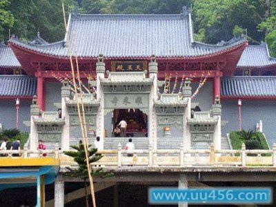 飞来寺的建造及命名,有一个颇具传奇色彩的故事:建寺时选址原定在现址两公里以处的地方,全部用料已经备齐,就在破土动工的头天晚上,柱梁等主要建筑材料不翼而飞,住持和尚派人寻踪追迹。找到现址时,发现柱梁已按规格竖好,且无大殿的后梁后柱,从头以为这是神意,于是遵照神意把寺建于现址,并因柱梁飞来自立,命其为“飞来寺”。今天,站在豆温村边远看飞来寺,确有欲飞之势。山峦叠宕,森林茂密,云雾缭绕之中显现的古寺,有斩云断雾之姿,更有凝而不变之影,真是悬崖陡处辟仙台,琼楼玉宇屹正乙。